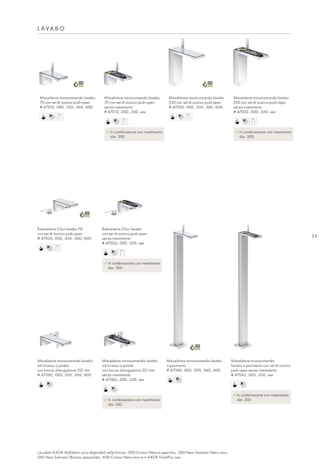 I prodotti AXOR MyEdition sono disponibili nelle finiture: -000 Cromo ⁄ Vetro a specchio, -350 Nero Satinato ⁄ Vetro nero,