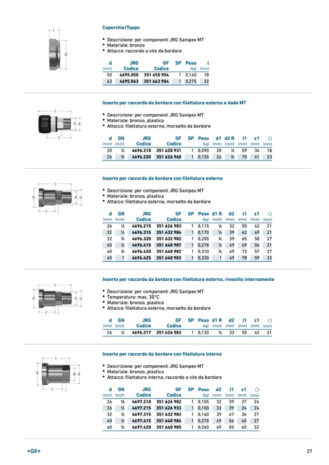 Inserto per raccordo da bordare con filettatura esterna e dado MT