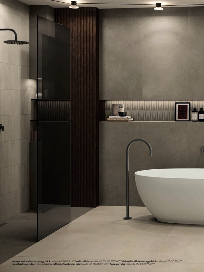 washbasin: porridge matte soft niche: caffelatte/mushroom prism matte soft 30x30 114/5"x114/5" floor: porridge matte ptv 60x120 235/8"x471/4"