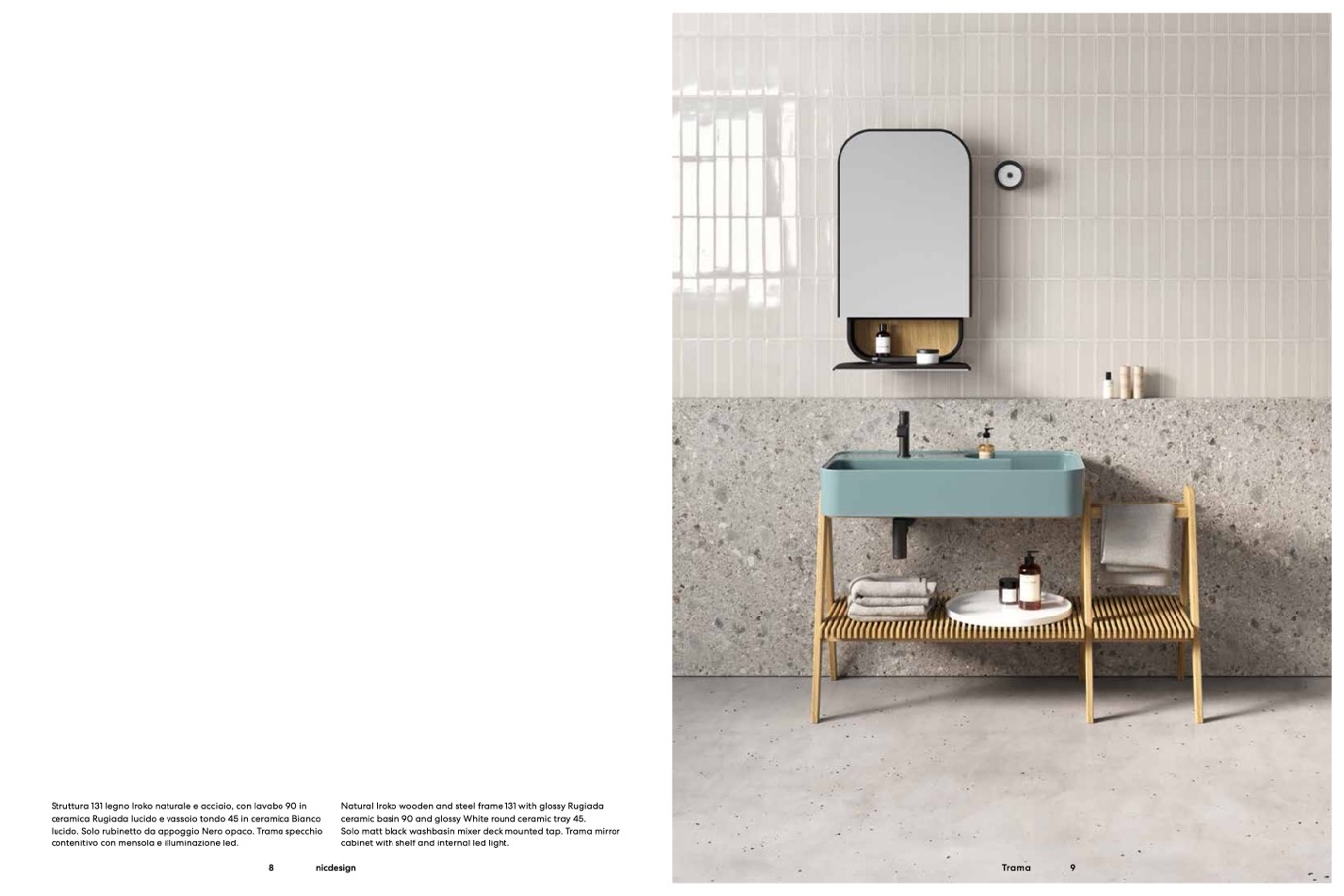 Struttura 131 legno Iroko naturale e acciaio, con lavabo 90 in