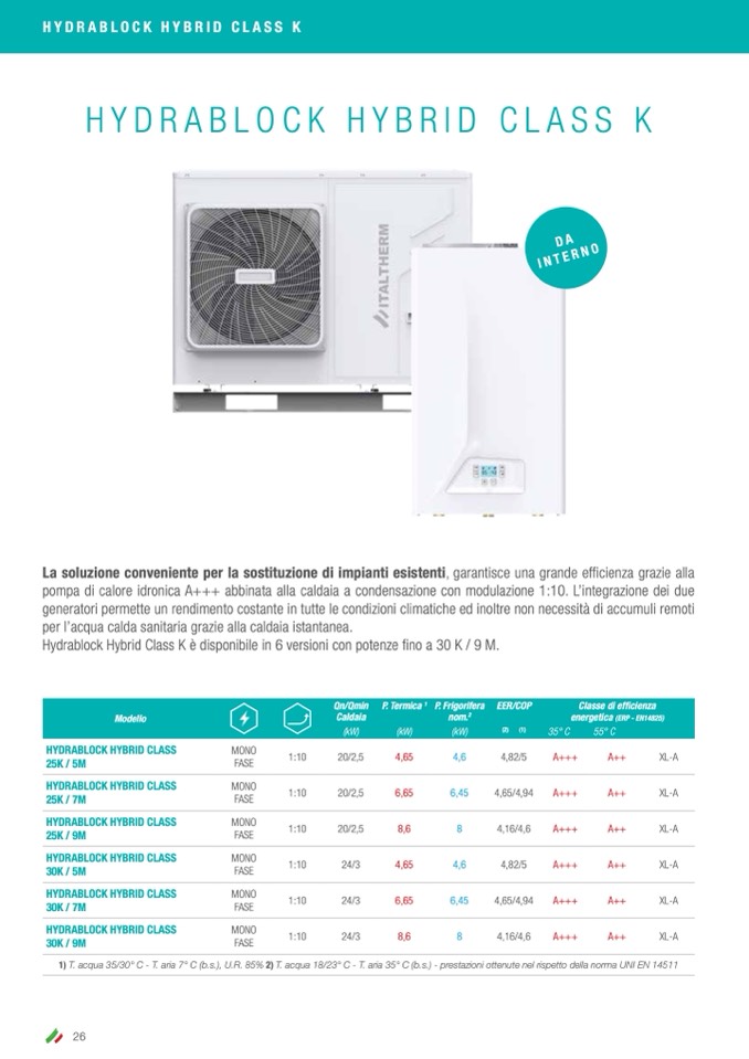 1) T. acqua 35/30° C - T. aria 7° C (b.s.), U.R. 85% 2) T. acqua 18/23° C - T. aria 35° C (b.s.) - prestazioni ottenute nel rispetto della norma UNI EN 14511