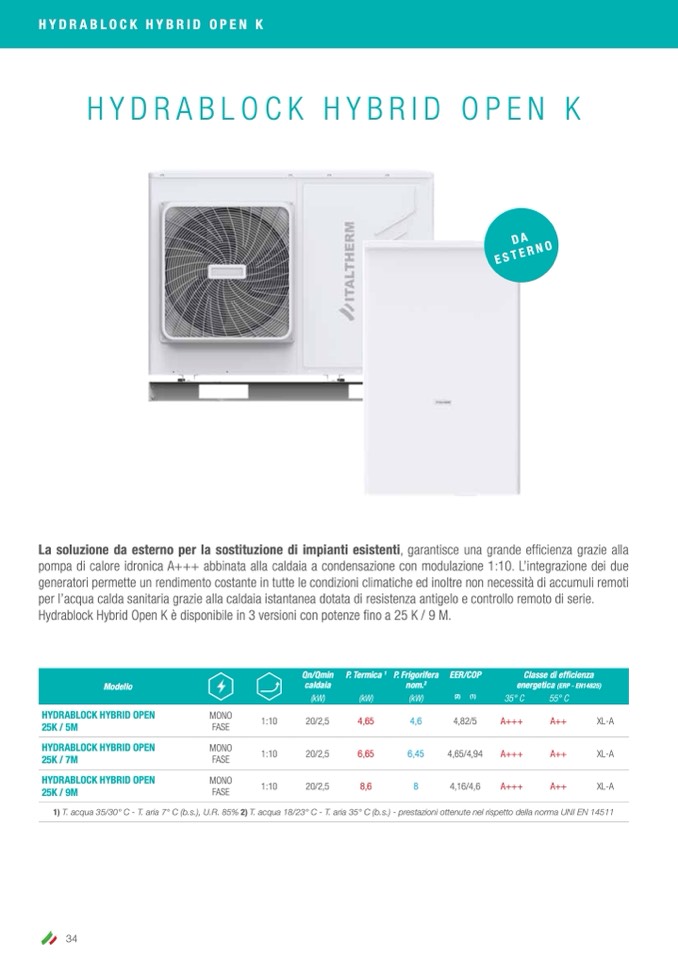 1) T. acqua 35/30° C - T. aria 7° C (b.s.), U.R. 85% 2) T. acqua 18/23° C - T. aria 35° C (b.s.) - prestazioni ottenute nel rispetto della norma UNI EN 14511