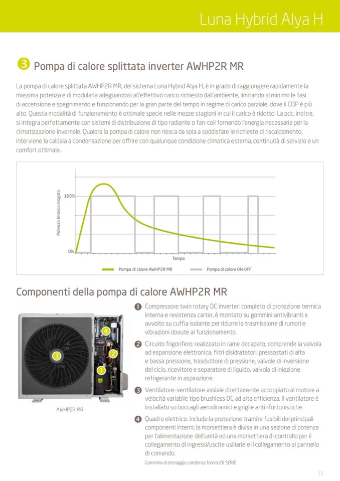 La pompa di calore splittata AWHP2R MR, del sistema Luna Hybrid Alya H, è in grado di raggiungere rapidamente la