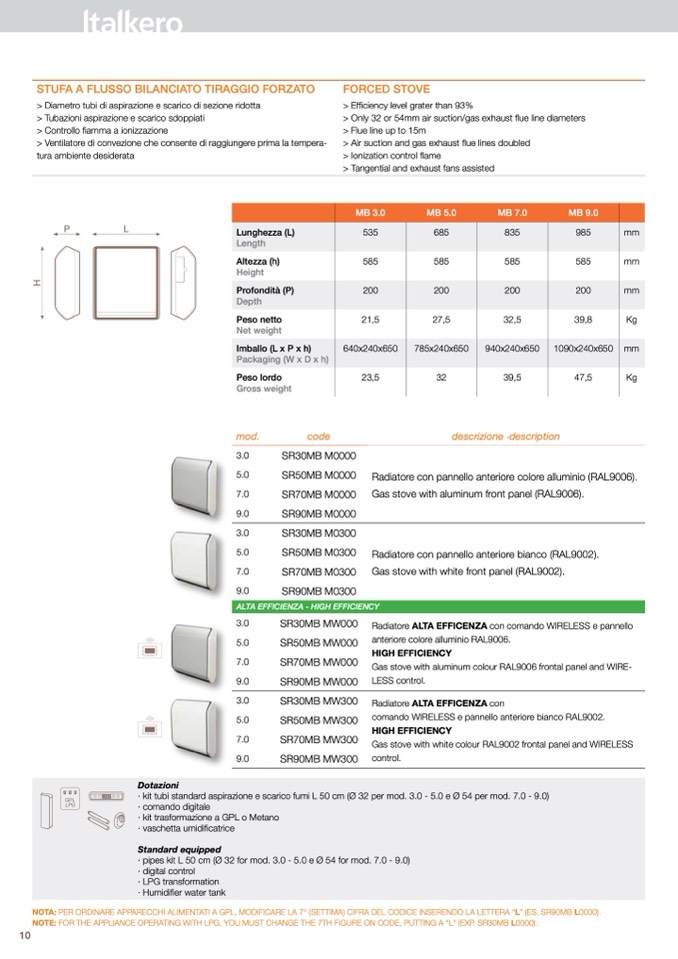 NOTA: peR ORdInaRe appaRecchI aLIMentatI a gpL, MOdIfIcaRe La 7° (SettIMa) cIfRa deL cOdIce InSeRendO La LetteRa “L” (eS. SR90Mb L0000).