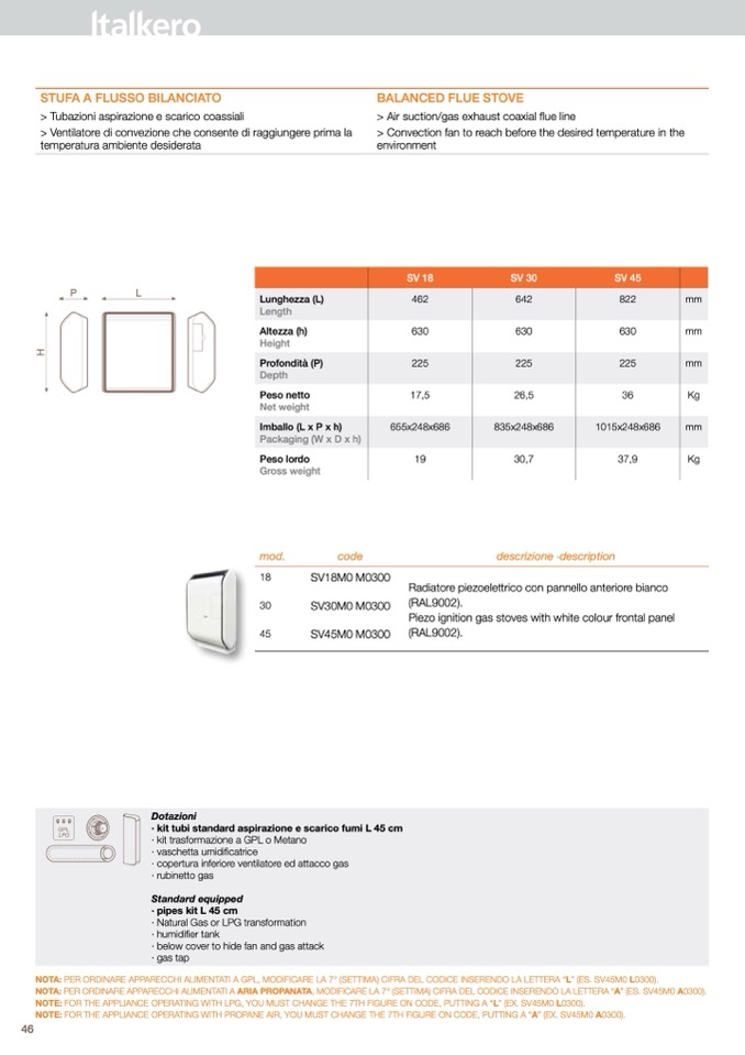 NOTA: peR ORdInaRe appaRecchI aLIMentatI a gpL, MOdIfIcaRe La 7° (SettIMa) cIfRa deL cOdIce InSeRendO La LetteRa “L” (eS. Sv45M0 L0300).