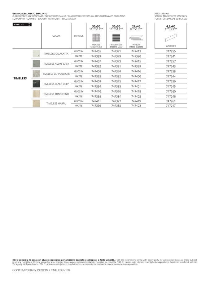 to strong humidity. / 3D:pose conseillée avec mortier époxy pour environnements très humides ou mouillés. / 3D: In nassen oder starker Feuchtigkeit ausgesetzten Bereichen empfiehlt sich die